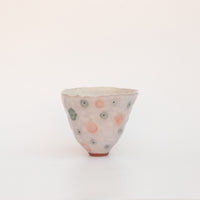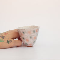 Small earthenware ceramic cup with claystone from Gaspésie handmade by Cybèle B.Pilon in Montréal, Québec, Canada. The size is perfect for a turkish coffee or a fancy tea. The iron naturally present in the clay gives a dark reddish brown hue to this one of a kind piece. Colorful patterns are painted on a white tin glaze with the decorative technique Majolica, also referred to as maiolica .