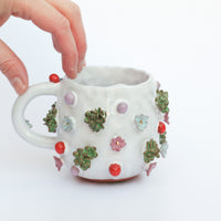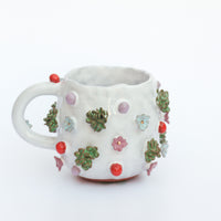 Small earthenware ceramic mug with claystone from Gaspésie handmade by Cybèle B.Pilon in Montréal, Québec, Canada. The iron naturally present in the clay gives a dark reddish brown hue to this one of a kind piece. Each flower are shaped by hand and enhanced colors and 22k gold. The mug is glazed with a white tin glaze.