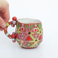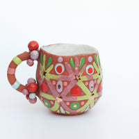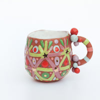 Small earthenware ceramic mug with claystone from Gaspésie handmade by Cybèle B.Pilon in Montréal, Québec, Canada. The iron naturally present in the clay gives a dark reddish brown hue to this one of a kind piece. The colorful patterns are water carved or hand-painted on raw clay before firing and enhanced with 22k gold. The exterior of the mug is unglazed and the interior, hammered by fingers, is covered with a white tin glaze. The edge of the lips is carefully glazed with a transparent glaze. This sturdy mug is perfect for everyday use.