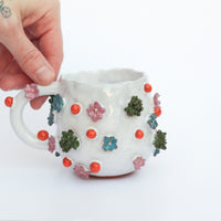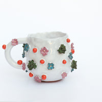 Small earthenware ceramic mug with claystone from Gaspésie handmade by Cybèle B.Pilon in Montréal, Québec, Canada. The iron naturally present in the clay gives a dark reddish brown hue to this one of a kind piece. Each flower are shaped by hand and enhanced colors and 22k gold. The mug is glazed with a white tin glaze.