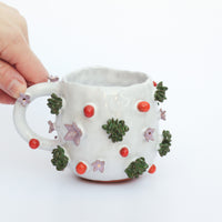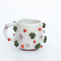 Small earthenware ceramic mug with claystone from Gaspésie handmade by Cybèle B.Pilon in Montréal, Québec, Canada. The iron naturally present in the clay gives a dark reddish brown hue to this one of a kind piece. Each flower are shaped by hand and enhanced colors and 22k gold. The mug is glazed with a white tin glaze.